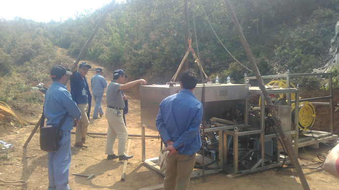 2017年4月12日,工廠研發(fā)與創(chuàng)新中心組織人員到武定分廠開展JWL-DXRH型地下模塊式裝藥器的帶料試驗。工廠工藝技術研發(fā)室、裝備技術研發(fā)室、安全技術檢測室、設備動力管理部、信息管理中心、武定分廠、云南安化五八一有限公司、深圳市金奧博科技股份有限公司共抽調(diào)30余人配合進行此次試驗。